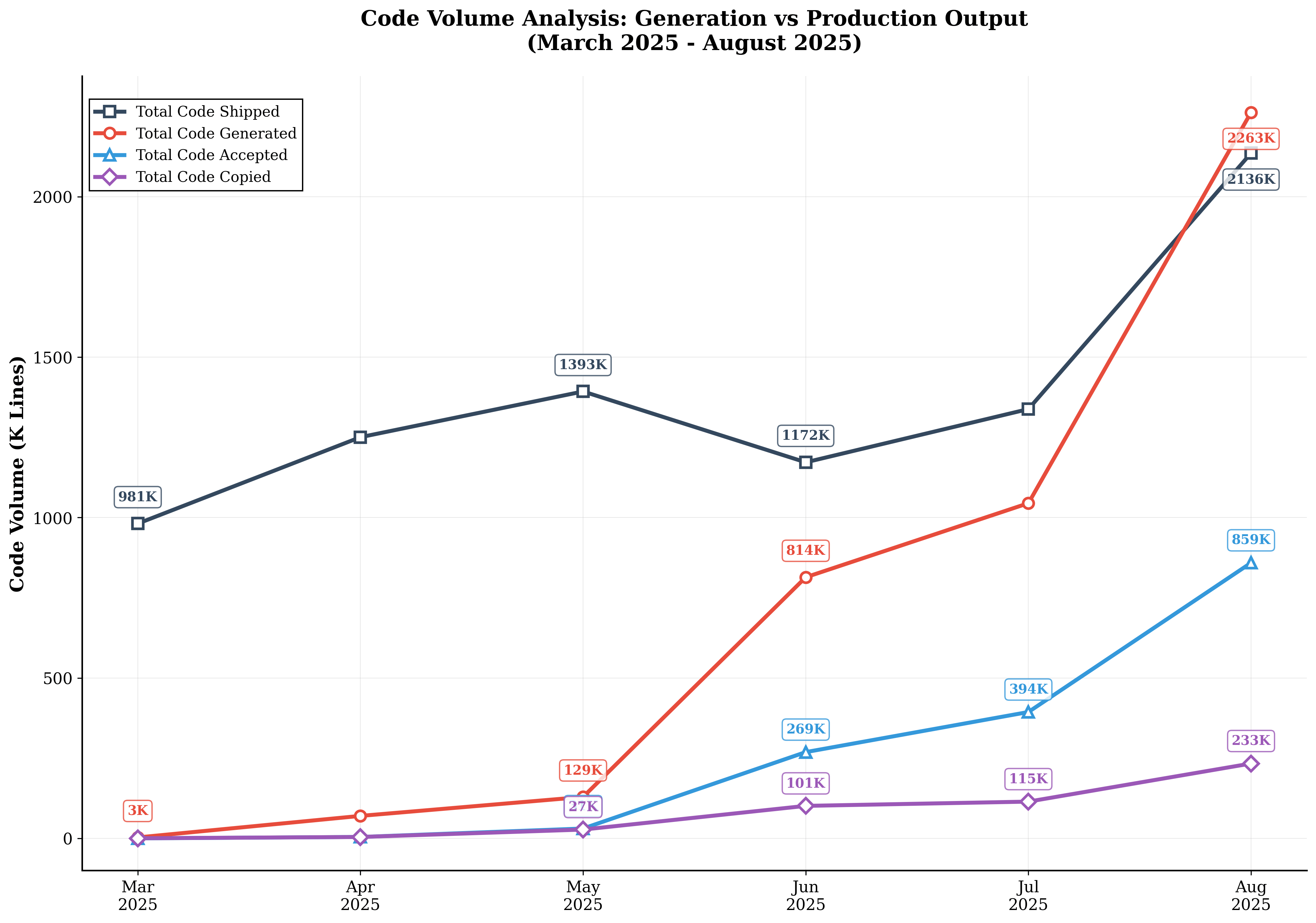 Code Volume Growth Analysis: AI-generated code progression from 3,000 lines (March 2025) to 2.26M lines (August 2025). Around 40% AI generated code shipped in production in August 2025 and 28% increase in production code volume.